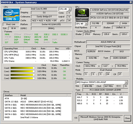 As for the hardware… well, I’m married, I have two kids, and this automatically qualifies me as the least important living thing around the house. But still, ASUS P8P67 LE, 8 GB of RAM, Intel i5 – a quad core 2400 series, it’s not that bad, after all.