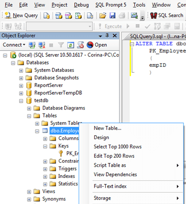- Expand your database node (testdb, in my case), navigate to your table, right-click it and select Design from the menu. Do not worry about the extra menus and buttons that you see, they are installed when you install SQL Toolbelt, a wonderful gift that I have from our friends at Redgate.